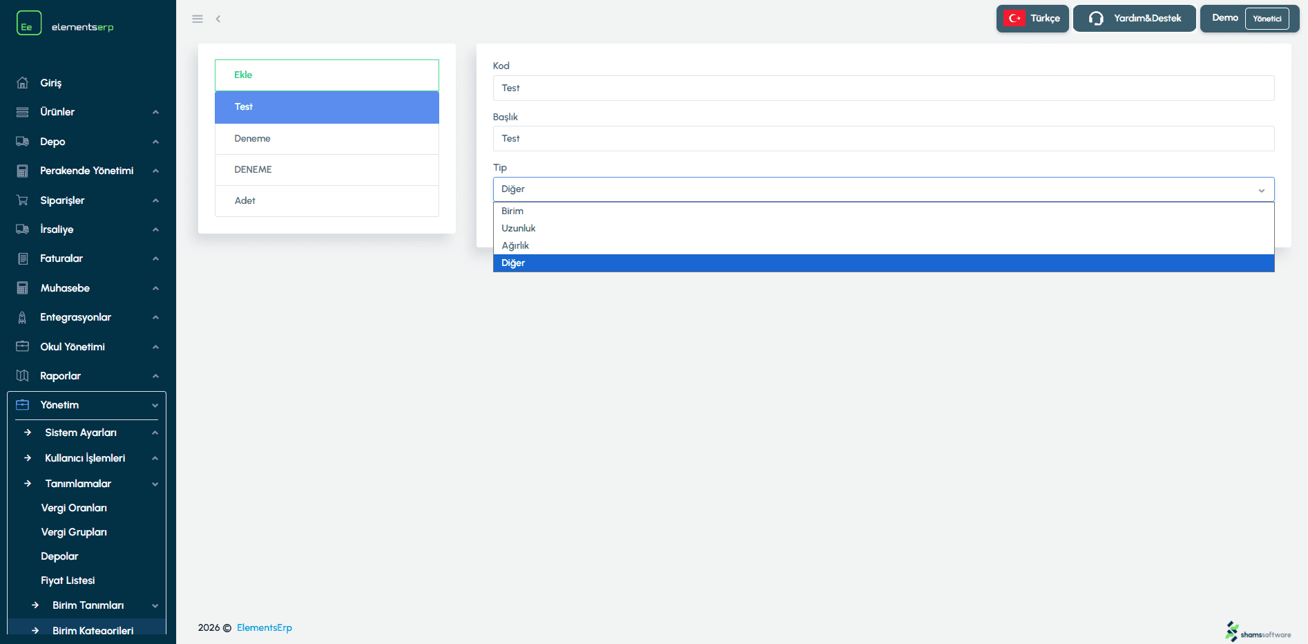 Unit (Birim): Genel sayılabilir birimler (Adet, Kutu vb.).