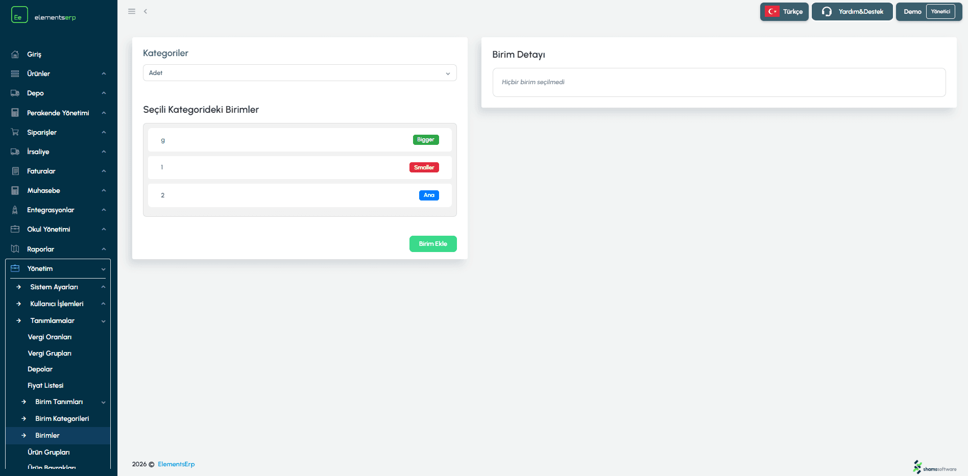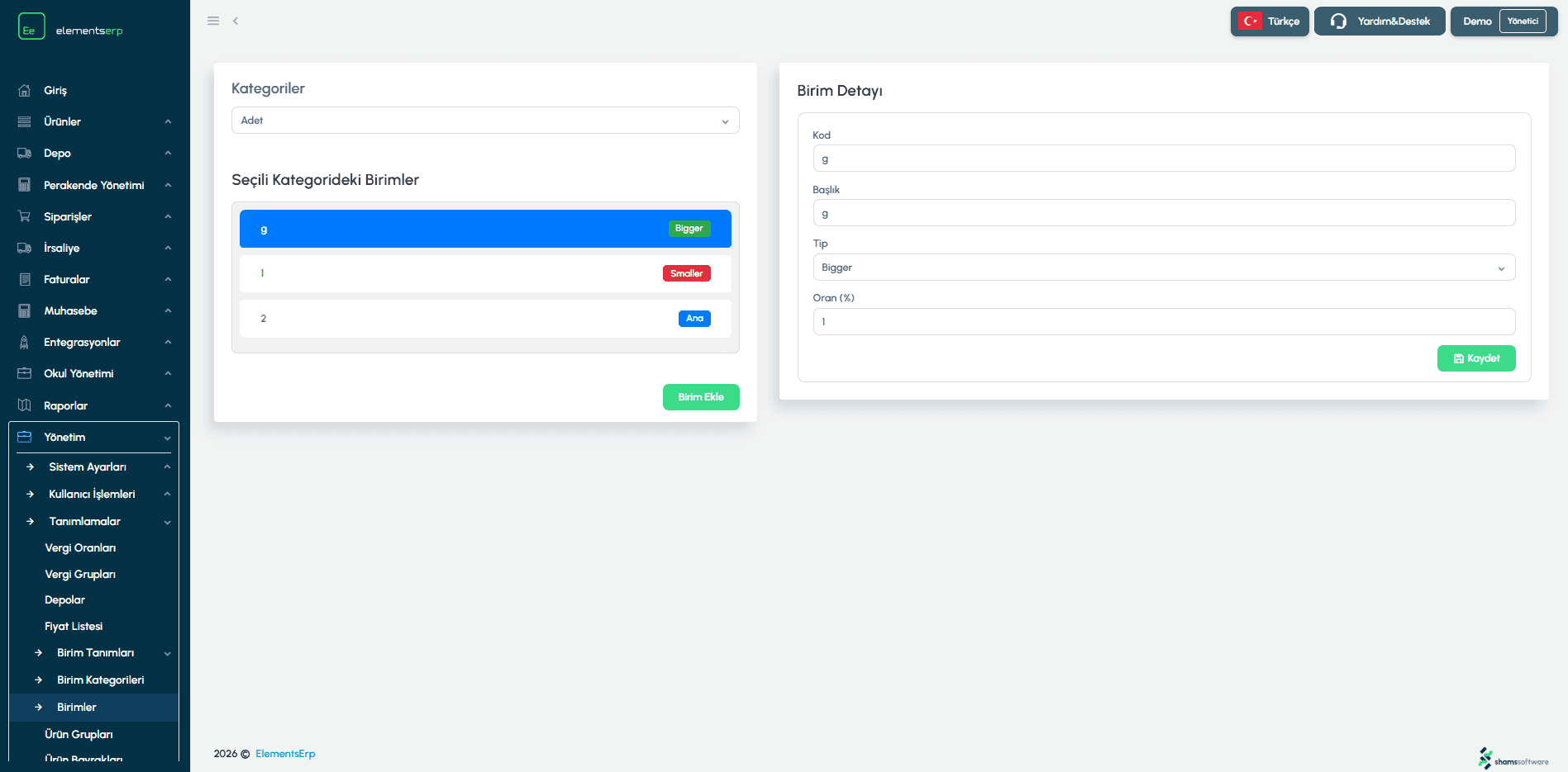 Seçilen veya yeni eklenen birimin detaylarını sağ panelden yönetebilirsiniz.