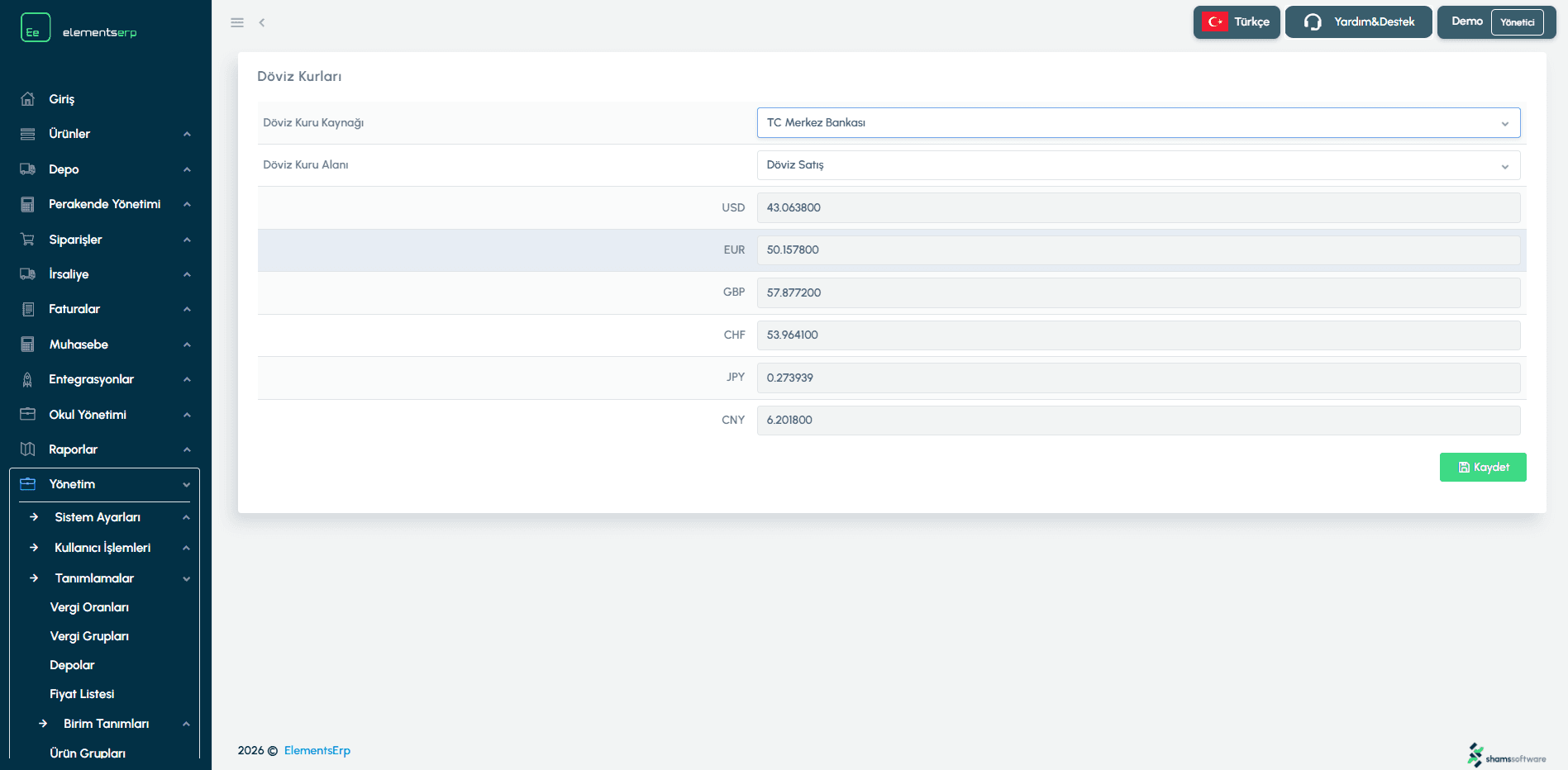 Yapılandırmayı veya manuel kur girişlerini tamamladıktan sonra ekranın altındaki "Kaydet" (Save) butonuna basarak işlemi tamamlayın. Kaydettikten sonra sistemdeki tüm yeni işlemler bu ayarları kullanmaya başlayacaktır.