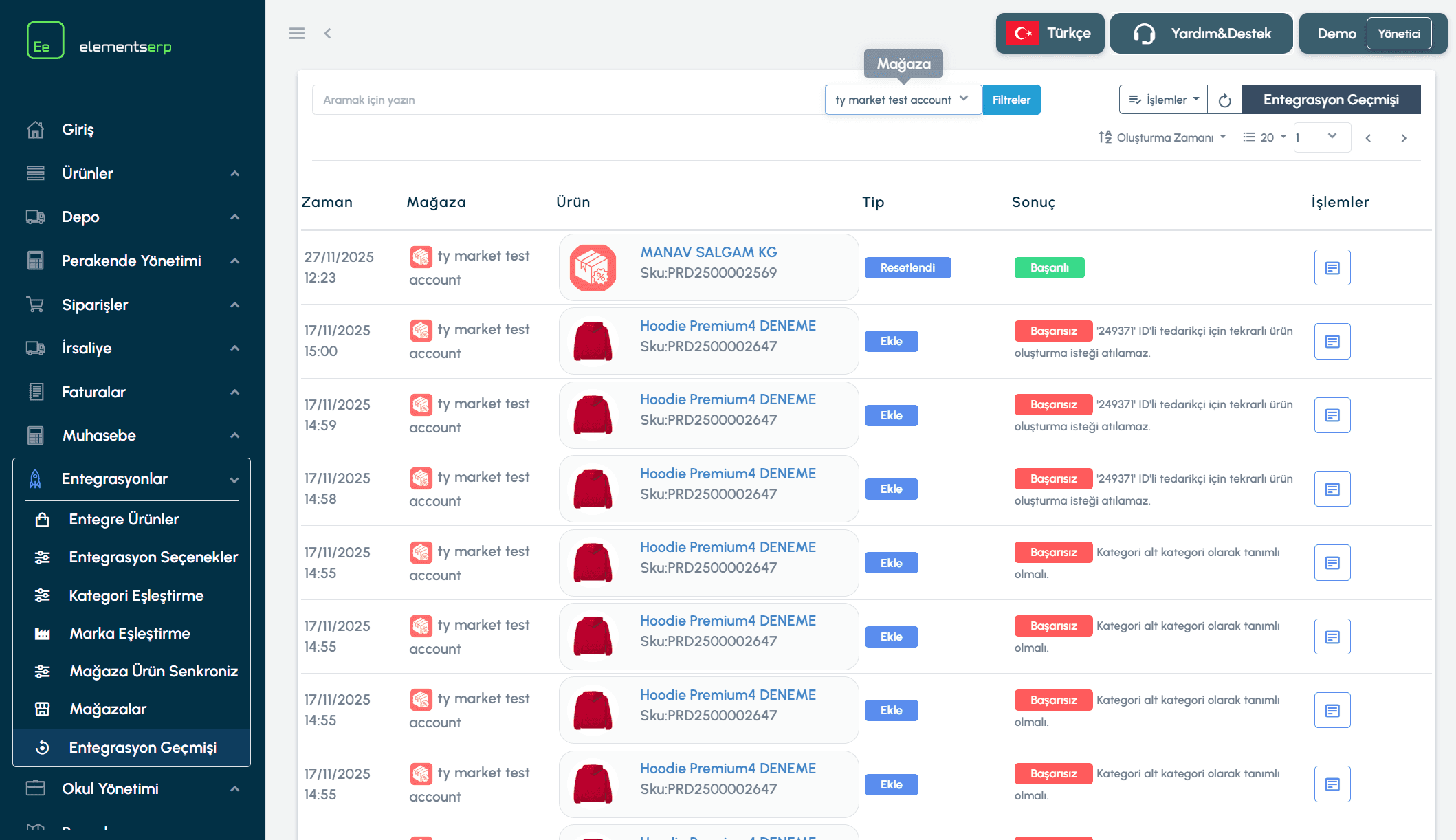 İpucu: Hata mesajlarında genellikle "Marka eşleşmedi", "Kategori zorunlu alan eksik" gibi ifadeler yer alır. Bu ipuçlarını kullanarak Marka Eşleştirme veya Kategori Eşleştirme ekranlarında gerekli düzeltmeleri yapabilirsiniz.