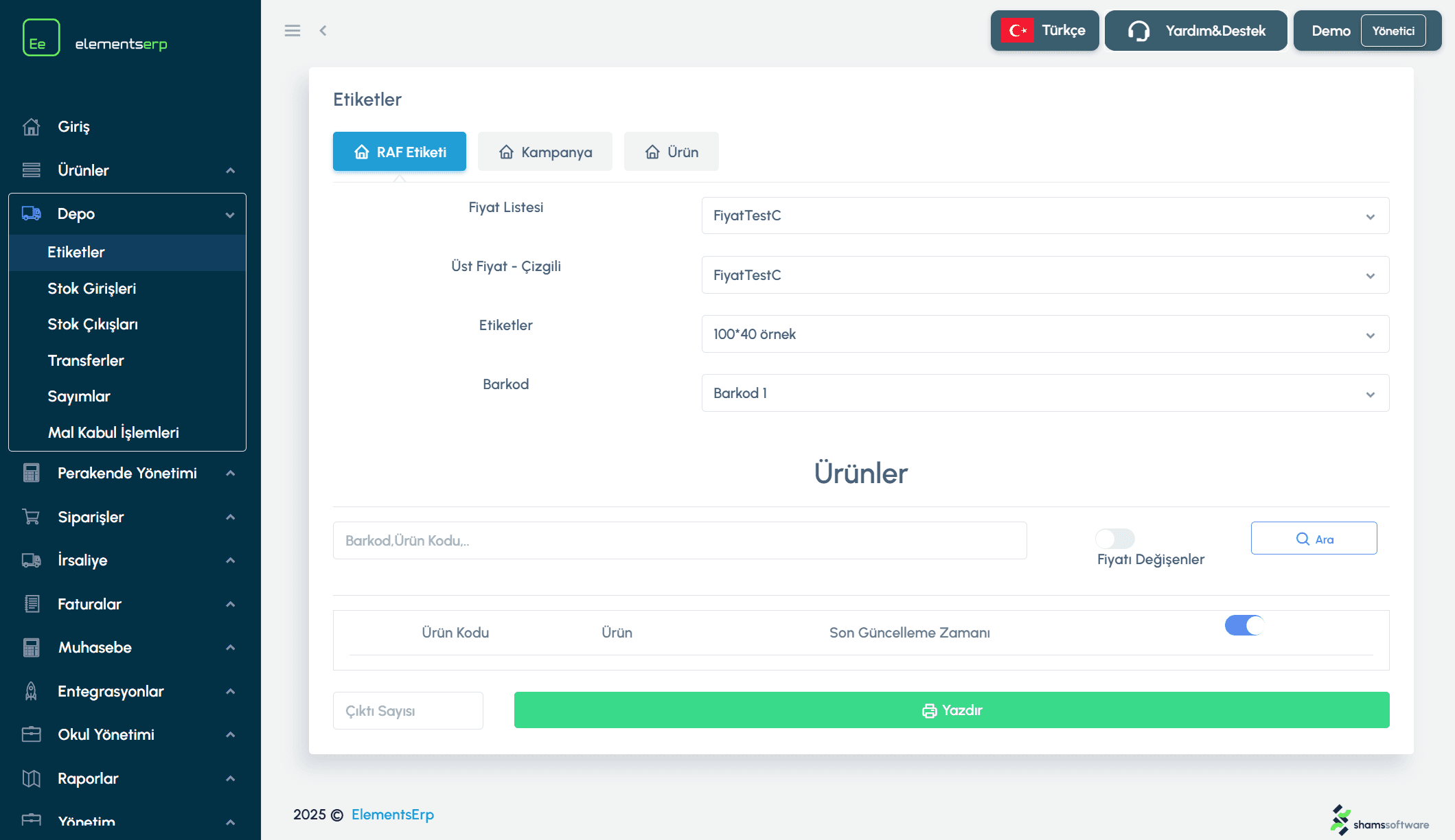 Şekil 1: Etiket türü sekmeleri, ürün arama ve toplu basım seçenekleri.
