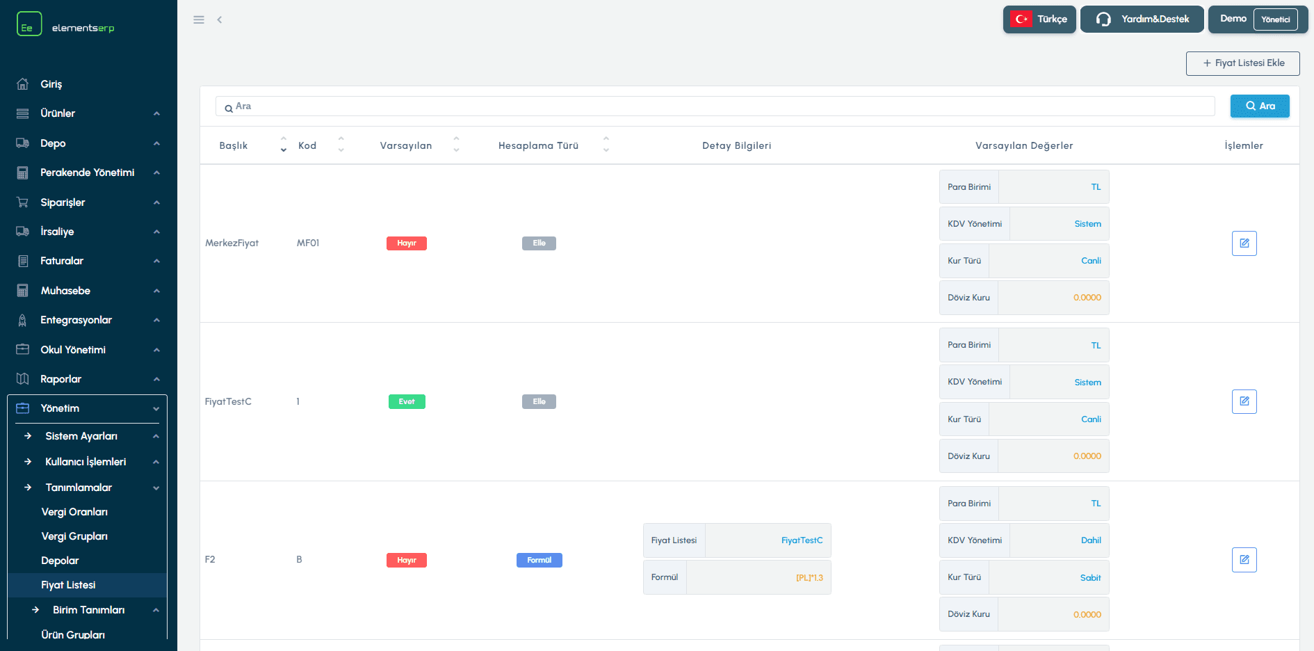 Mevcut fiyat listeleri bir tablo halinde görüntülenir.