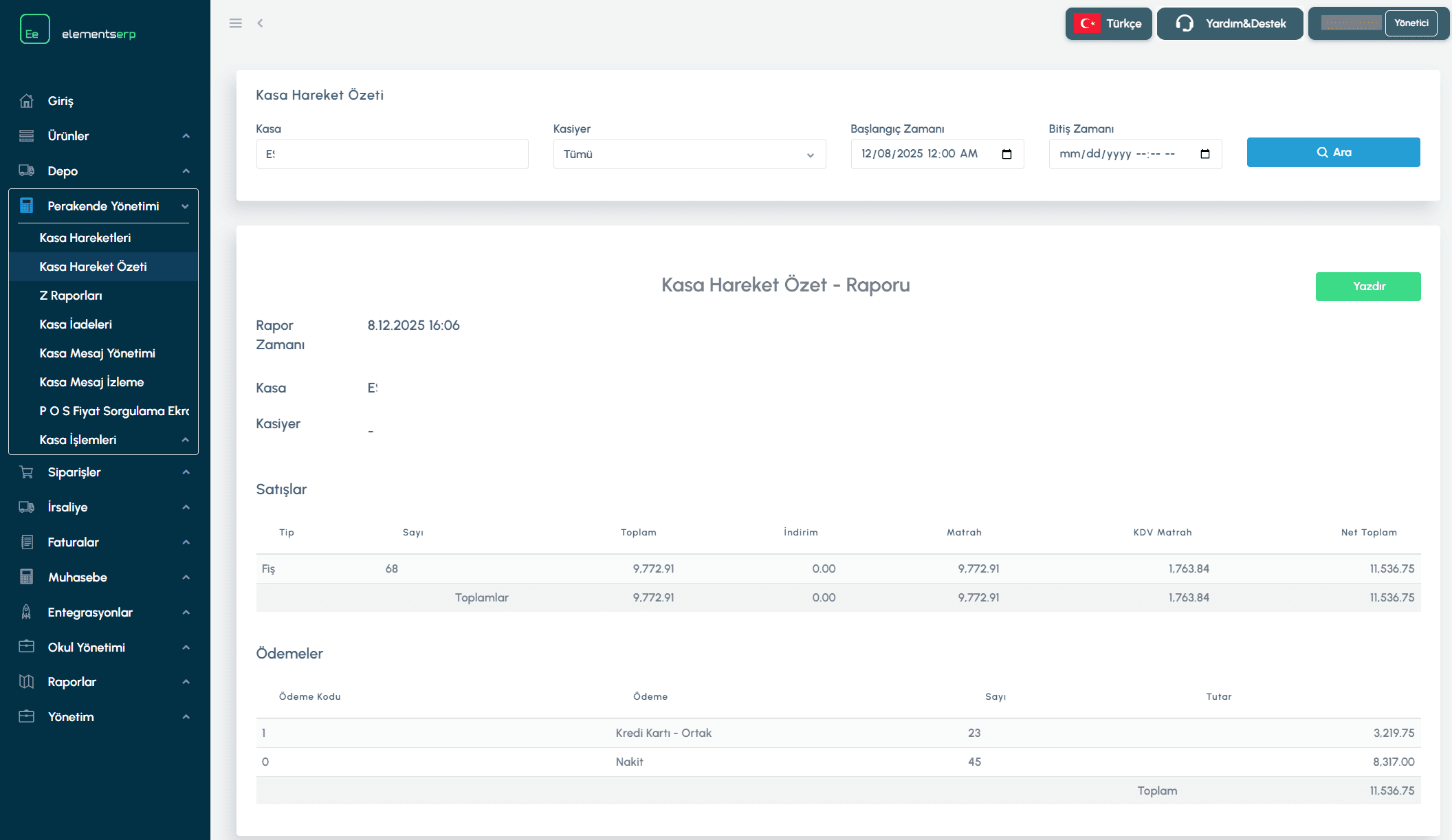 Raporun en altında bulunan "Yazdır" (Print) butonuna tıklayarak bu özeti yazıcıdan çıktı alabilir veya PDF olarak kaydedebilirsiniz. Çıktıda "Kasiyer" ve "Yetkili" imza alanları otomatik olarak yer alır.