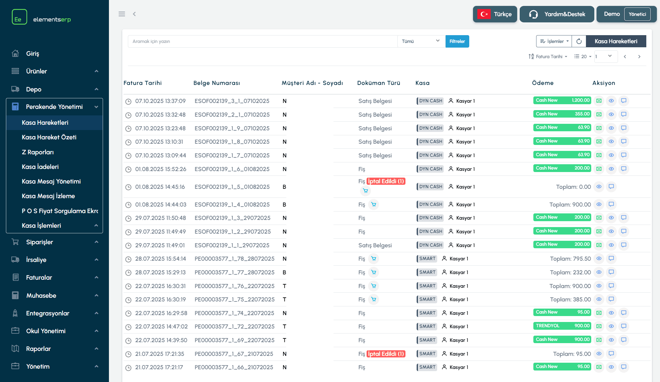 Belge Tipi: Satış, İade, İptal gibi işlem türü. (İptal edilenlerde "İptal" etiketi görünür).