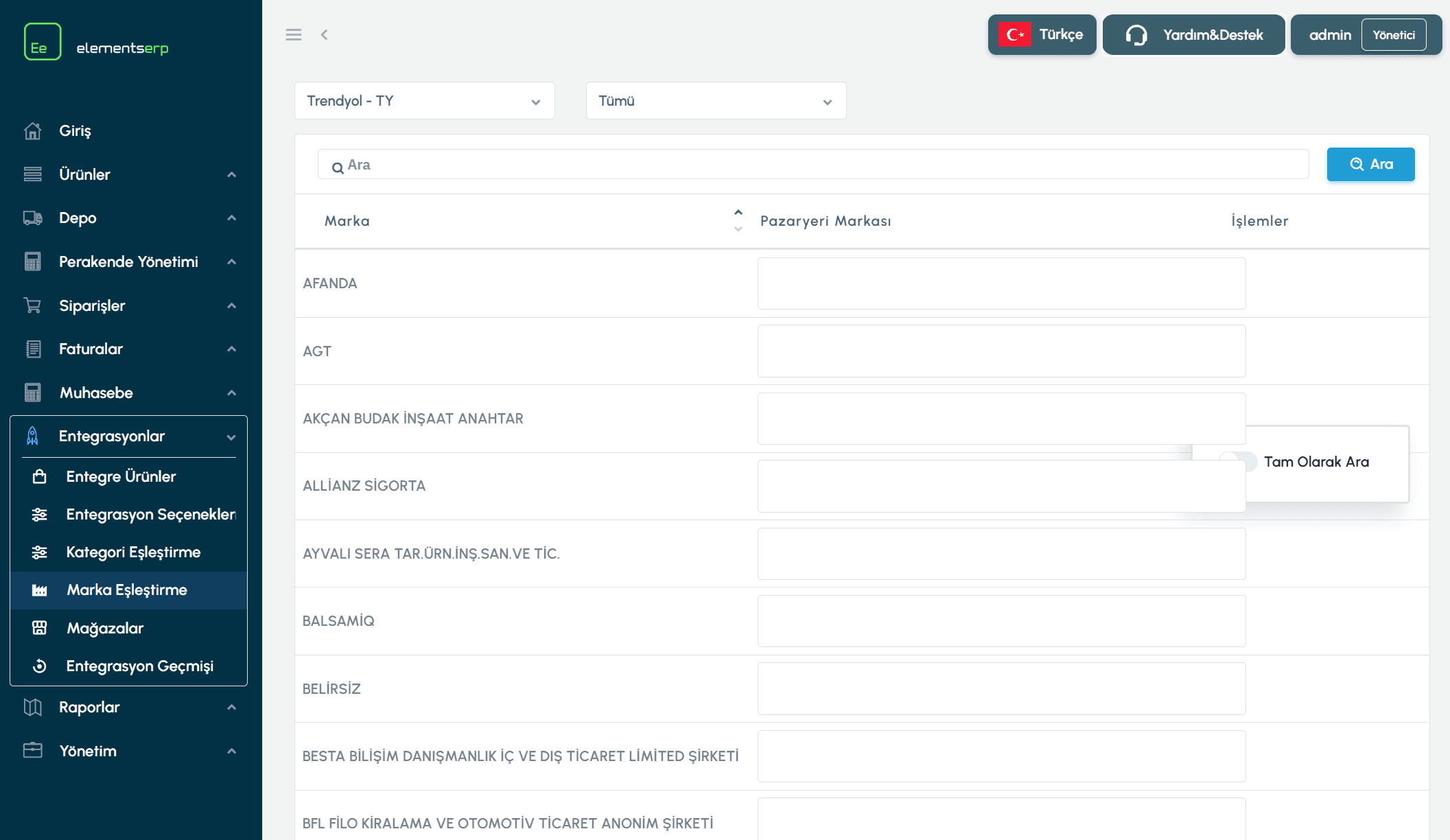 Tam Eşleşme (Search Exact): Bu anahtarı açarsanız, arama yaparken sadece tam isim benzerliği olan markaları getirir. Yanlış eşleşmeleri önlemek için kullanışlıdır.