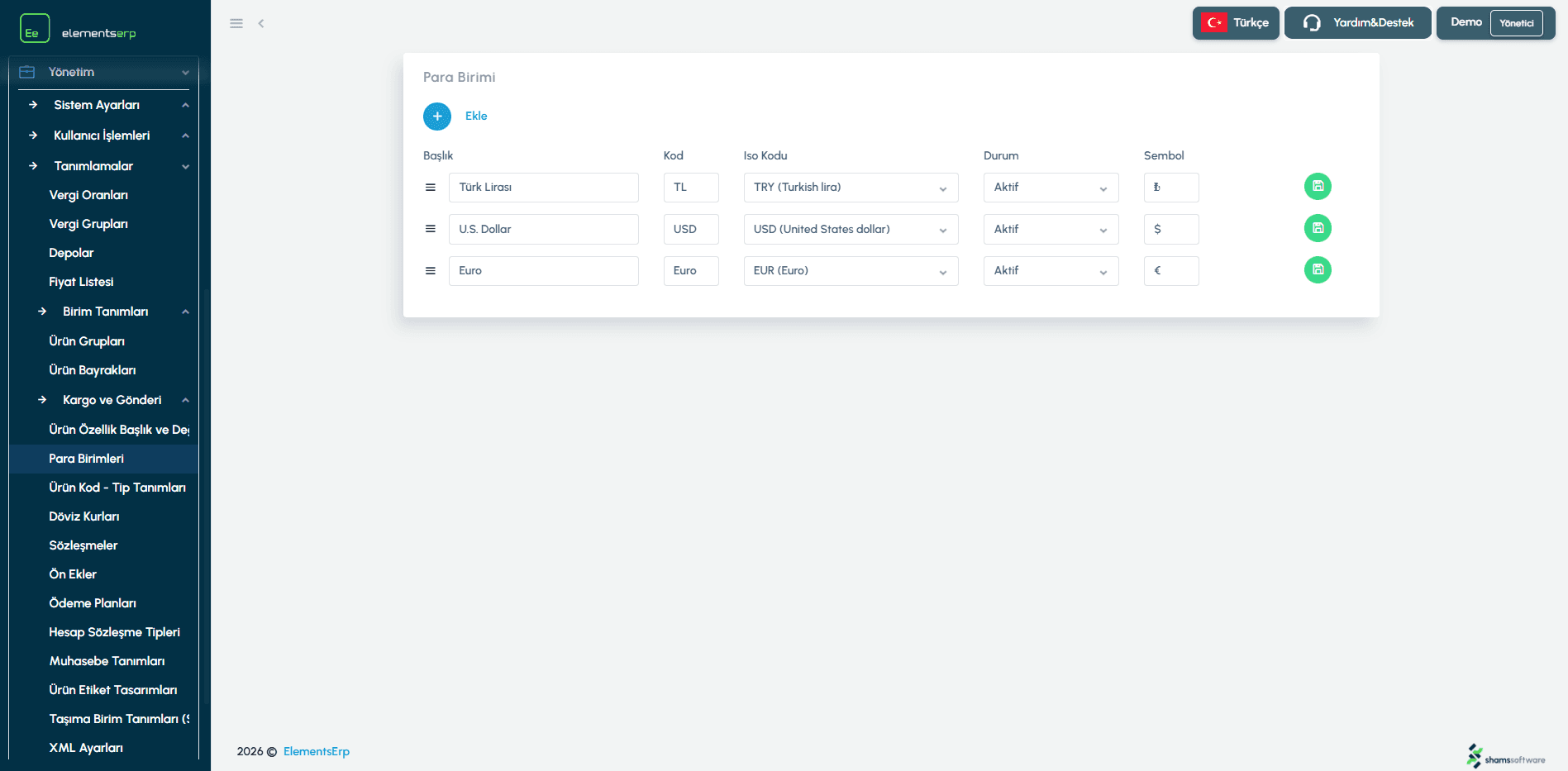 Cevap: Bu ekran sadece para birimi tanımını yapar. Günlük kur değerleri (Örn: 1 USD = 30 TL) "Döviz Kurları" ekranından yönetilir veya otomatik çekilir.