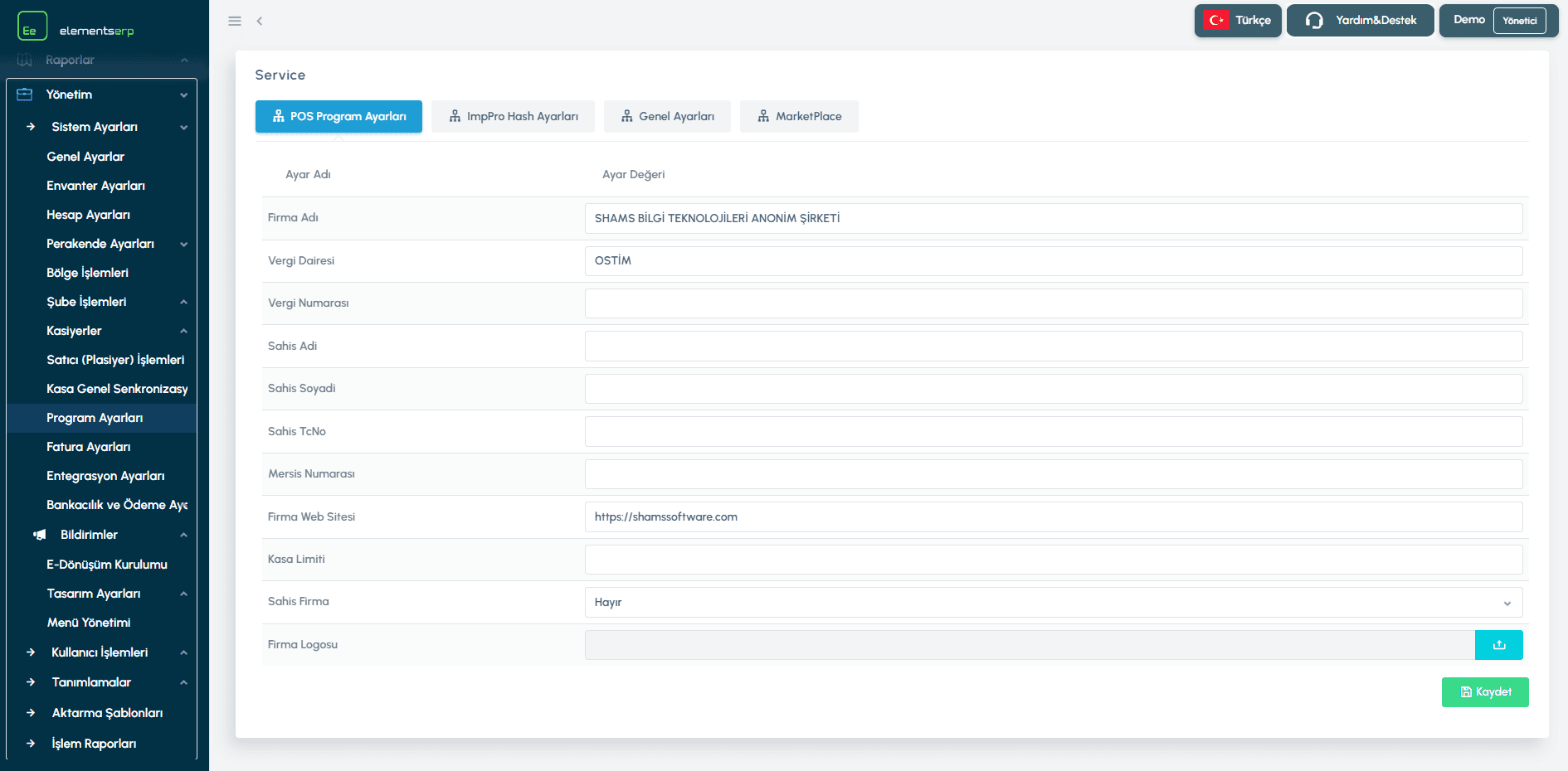 Ayarlar kategorilere (POS Programı, Şube, Kasa vb.) ayrılmıştır. Sadece değiştirdiğiniz alanlar kaydedilir.