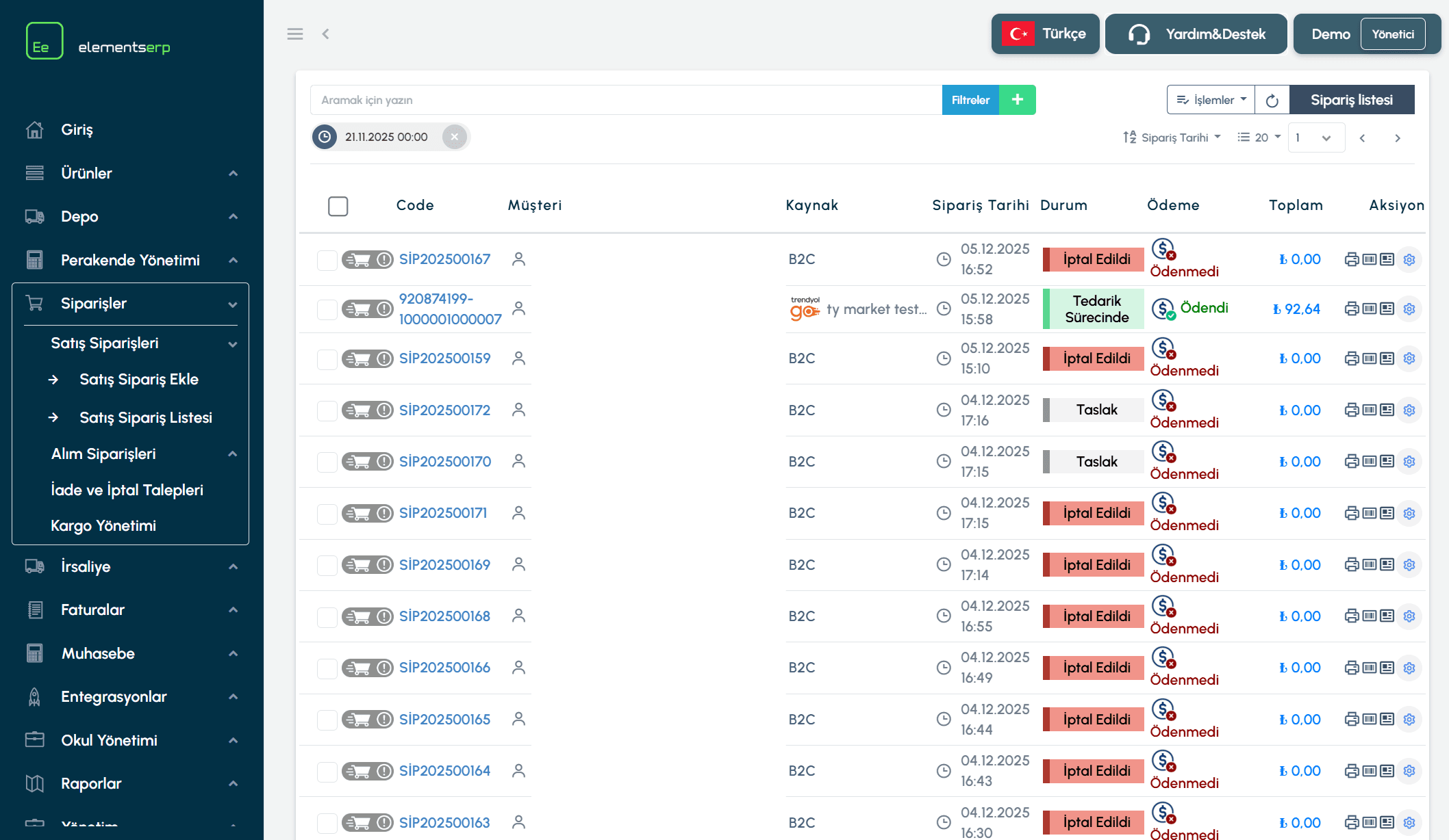 Şekil 1: Sipariş listesi, durum filtreleri ve toplu işlem araçları.