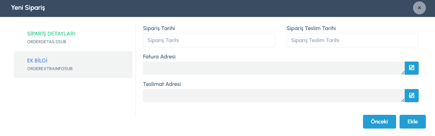 İpucu: Sihirbazı tamamlayıp "Kaydet" dediğinizde, sipariş taslağı oluşur ve otomatik olarak Ürün Ekleme ekranına yönlendirilirsiniz.
