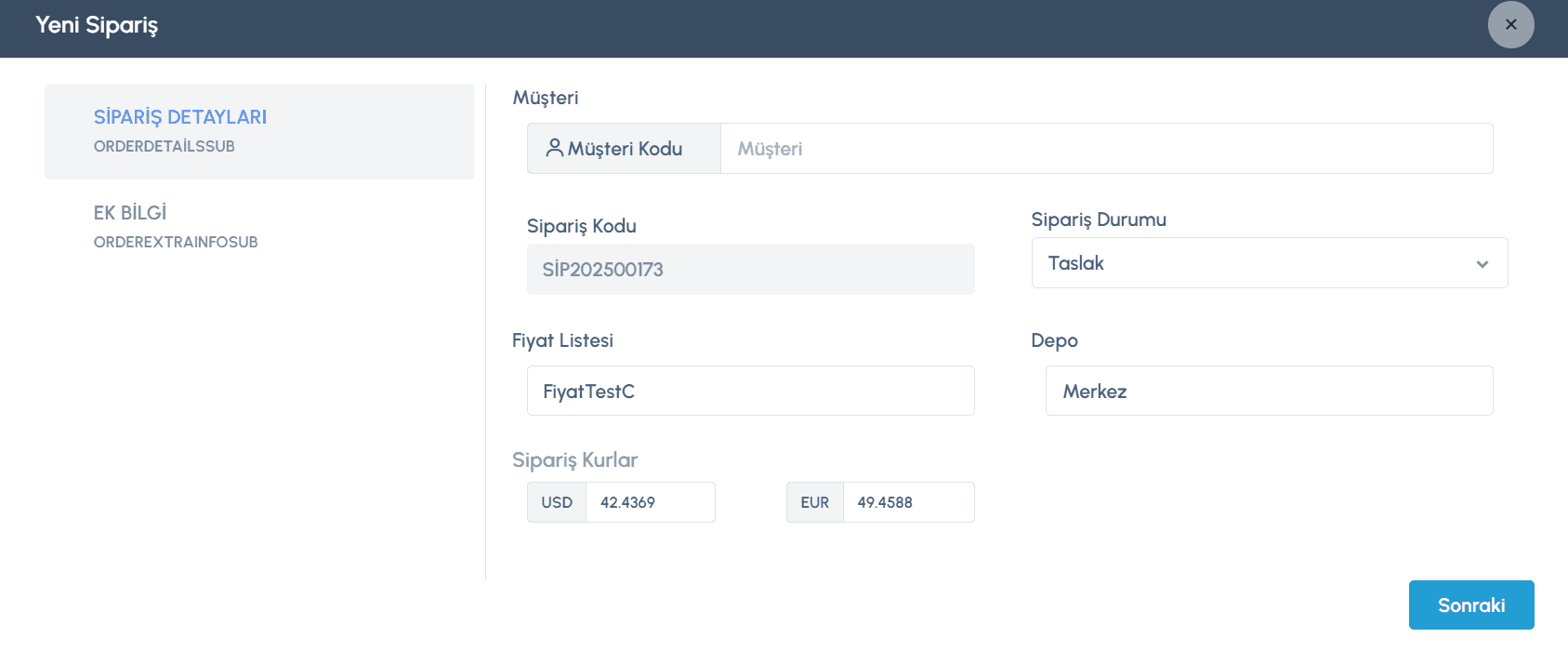 Müşteri (Customer): Siparişi veren cari hesabı seçin.