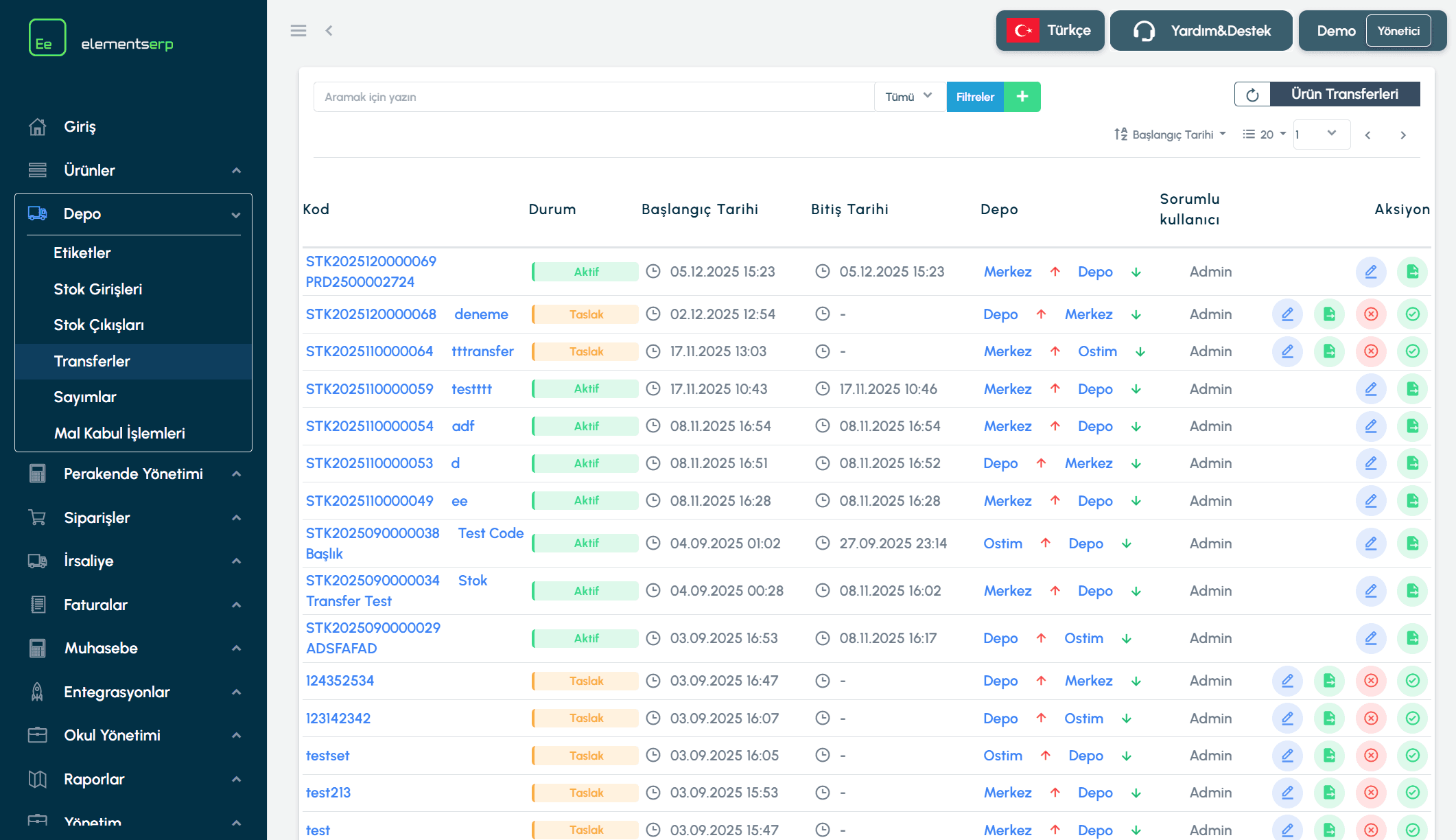 Gelişmiş Filtre: Belirli bir depoyu içeren transferleri ("Depo" alanından seçim yaparak) veya tarih aralığını filtreleyebilirsiniz.