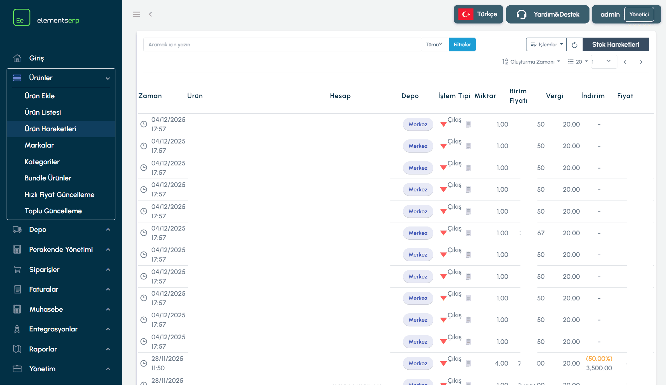 İpucu: Bir ürünün neden stoğunun eksiye düştüğünü veya fazla göründüğünü anlamak için; "Ürün" filtresinden o ürünü seçip, "Tarih Aralığı"nı genişleterek tüm geçmişini inceleyebilirsiniz.