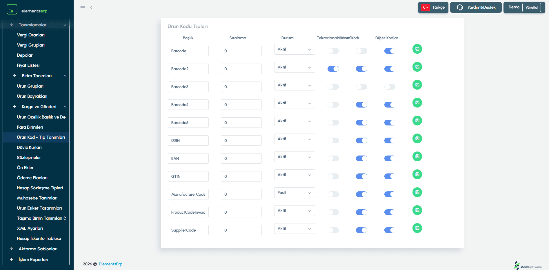 Durum (Status) | Kod tipinin aktif olup olmadığı. (Pasif yapılırsa yeni ürünlerde seçilemez). | Aktif |