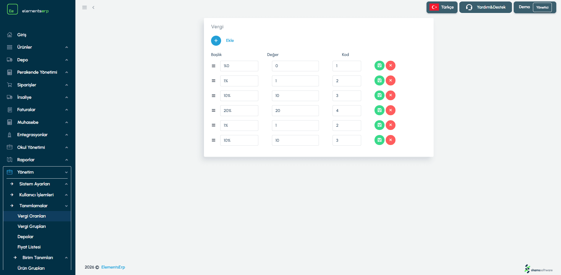 Sil (Delete): Bir vergi oranını kaldırmak için satırın sonundaki Kırmızı Sil butonuna basın.